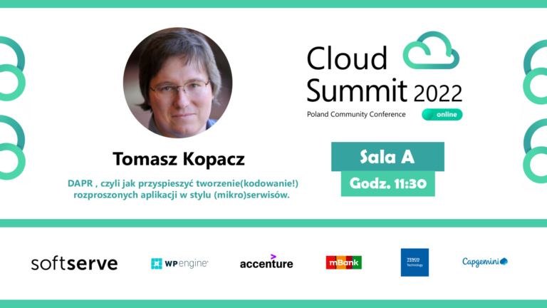 Distributed Application Runtime (DAPR) to malutki kontener - “sidecar” (albo proces) umieszczony obok głównej aplikacji który dostarczaj dodatkowego REST/gRPC API przydatnego podczas komunikacji pomiędzy usługami. Sam DAPR jest niezależny od użytego języka programowania czy frameworków. Może też dostarczyć dodatkową warstwę „abstrakcji” dla często używanych komponentów (jak kolejki czy zarządzanie stanem). Podczas te sesji przyjrzymy się, w jaki sposób można wykorzystać DAPR przy budowie aplikacji (a dokładniej – czego programista/architekt nie musi w ogóle robić dzięki użyciu tego API). Przykłady będą głownie w C#, ale jeden nawet w Python i JavaScript (Node.JS) Porozmawiamy także o tym, czym DAPR różni się od wielu rozwiązań typu „Service Mesh” (uprzedzając – DAPR przeznaczony jest bardziej dla programistów, Mesh to bardziej infrastruktura; ale istnieje duża część wspólna). Ps. DAPR działa wszędzie. Oczywiście na Azure (AKS lub ACA), ale też on-premise czy u innych dostawców chmury!